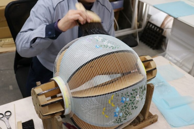 それを張師さんが刷毛を使って糊を打ち、提灯の形に張っていきます。寸分の狂いもなく、絵柄がきれいにそろうのは、熟練の技術によるものでしょう。貼った後に、不要な部分を紙一枚ぶんだけ剃刀で切り落とす手つきも鮮やかでした。