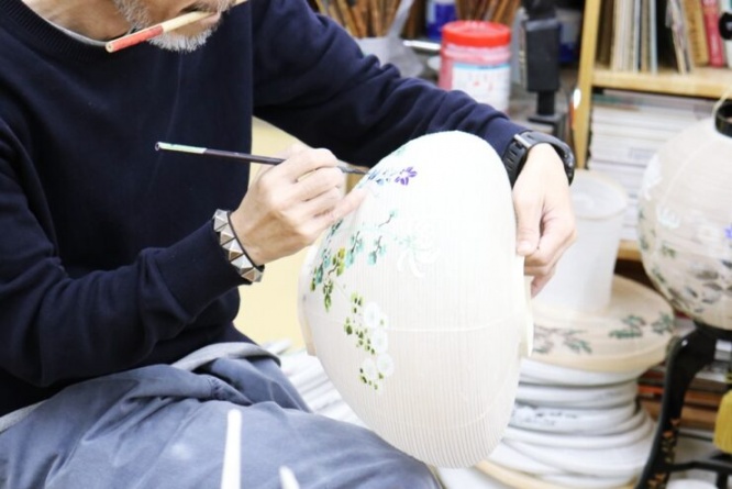 岐阜提灯は球形か卵型の清楚な形で、細工が精巧かつ火袋(ひぶくろ)の彩色絵が優雅秀麗です。特に、骨(竹ひご)が細く、極めて薄い紙に花鳥、風景、人物等の絵が描かれています。
