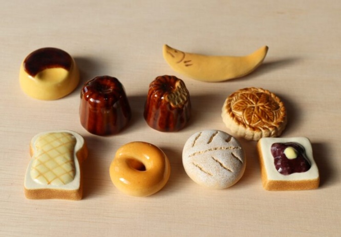 そのままの土の風合いを生かしたものもあれば、釉薬をぬって細部まで表現したものもあります。カヌレやプリン、ガレットデロア、ベーグル、若鮎など、本物と見まごう色や質感の箸置きは本当にかわいらしく、集めたくなってしまうほど。