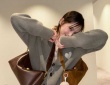 ブラウン系のセットアップにアウターを羽織り落ち着いた色味ながら洗練された私服コーデが印象的だ。膝上丈のスタイルからのぞく脚元はいわゆる絶対領域を演出し自然体でありながら存在感のある一枚に仕上がっている。春を意識した広めのチークメイクも柔らかな表情を引き立てている。