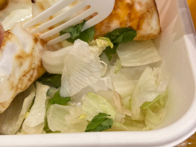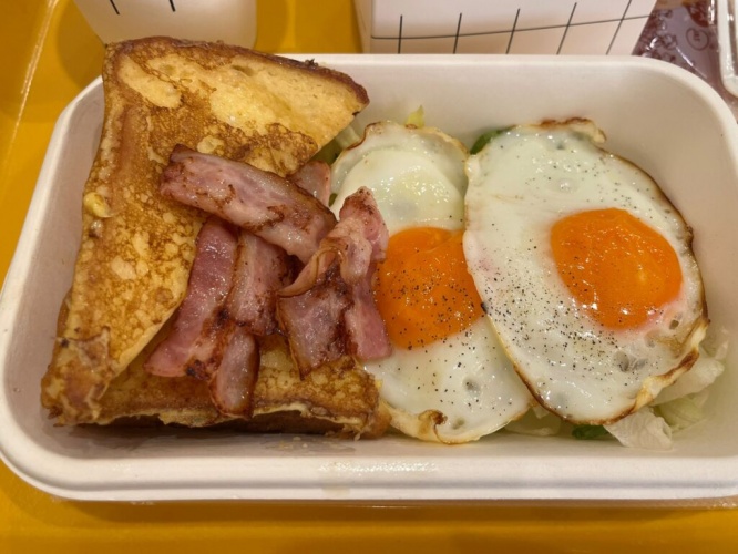 ベーコンと目玉焼き、野菜と一緒に食べるとそれぞれの旨みが相乗効果を生み出してたまりません!卵の黄身がよく絡んで最高です。