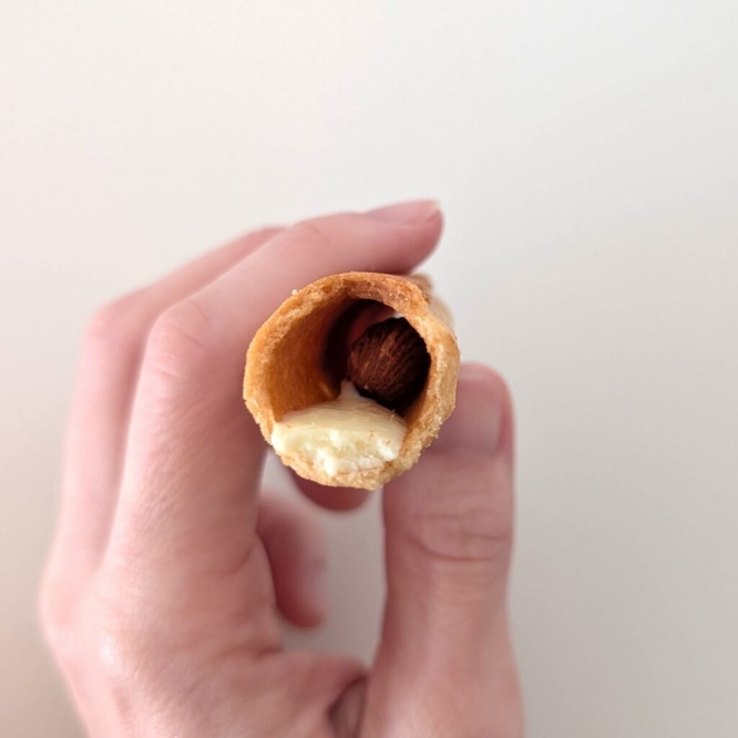 その中に、ふんわりとバニラが香るホワイトチョコクリームを絞り、花柄のホワイトチョコレートで華やかに仕上げた焼き菓子。中には素焼きアーモンドが入っており、サクサクと軽やかな食感の中に、カリッとしたアクセントをプラス。バターのコク、ホワイトチョコのやさしい甘さ、アーモンドの香ばしさが重なり合い、見た目以上に奥行きのある味です。