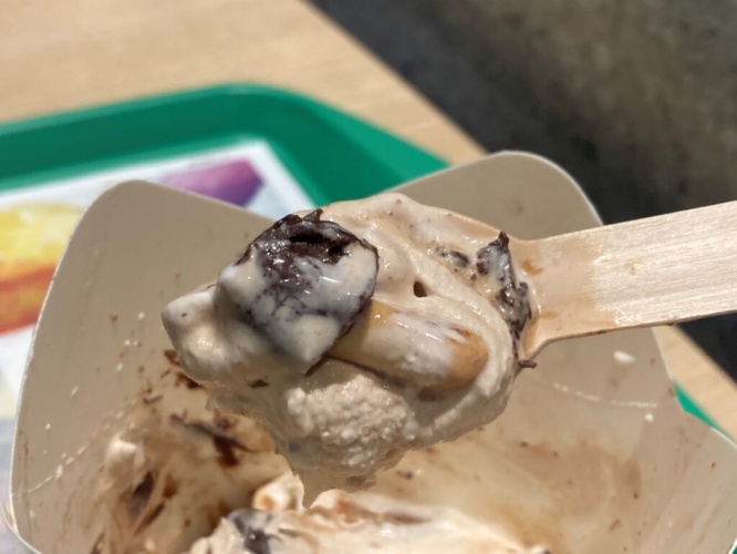 きのこも一緒に食べてみると、柄の部分のサクサクとチョコのゴロっとした食感が、こちらもソフトクリームと相性バツグン。チョコ部分の存在感が強く、香ばしさを感じます。たけのこときのこはそれぞれ2粒ずつ入っているので、量としての満足度が高いことも嬉しいポイント。最後にチョコソースをスプーンで混ぜていくと、バニラソフトがチョコソフトのような味わいに。ミックスする塩梅によって変化があるので、最後まで飽きずに満喫することができました。