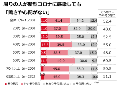 周囲の人が新型コロナに感染しても、「へぇ〜」くらいの感覚で「驚きや心配はない」かを問う質問では、11.0%が「そう思う」、41.4%が「ややそう思う」と回答。全体の約半数(52.4%)が、新型コロナ感染に対して「驚きや心配はない」と回答しました。