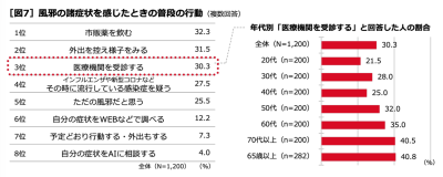 また、発熱、喉の痛み、咳、鼻水、倦怠感など風邪の諸症状を感じたとき、普段どんな行動をとるかを聞いた質問には、「市販薬を飲む」(32.3%)、「外出を控え様子をみる」(31.5%)との回答が多く、「医療機関を受診」すると回答したのは約3割(30.3%)にとどまりました。さらに約8割が発熱時に48時間以内が「早期受診」のタイミングと認識しているにもかかわらず、実際に風邪の諸症状を感じたときに「医療機関を受診する」と回答した人は3割程度という結果に。