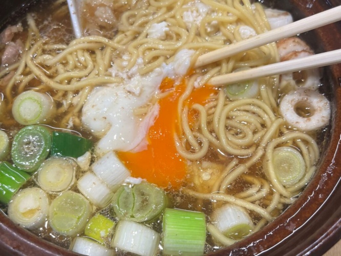 鍋の中の卵が半熟になったので、崩してみました。改めてスープを飲むと、最初のスープとは全く違った美味しさが広がります。すき焼き風とも異なる味わいに感動してしまいました。