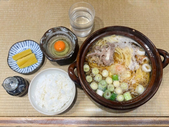 注文したのはもちろん『鍋焼きラーメン(ご飯付き)』(税込1100円)です。『追い卵』(税込100円)も一緒に頼みました。麺は、細麺か手打ち麺が選べるので、細麺をチョイス。