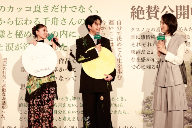 「そんなこのお3方を一度に見られる『クスノキの番人』です!皆様の宝物の1つにしていただいて、私たちがこの作品にかけるいろんなものを受け止めて頂いて、たくさんの方に宣伝して頂けたら、もっともっとクスノキの輪が広がっていくかなと思います」としっかり魅力をアピールすると、会場から盛大な拍手が贈られた。