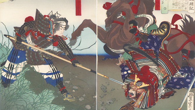 18歳で初陣&初首級歌川豊宣「新撰太閤記」より、木下藤吉郎が伊東日向守を討つ図