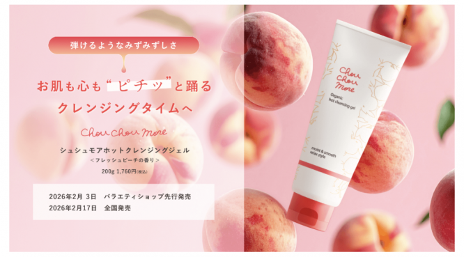 株式会社桃谷順天館のホットクレンジングシリーズ「シュシュモア」から、フレッシュピーチが香る「シュシュモアホットクレンジングジェル」が、2月3日に先行発売された。一般発売は2月17日に開始される。