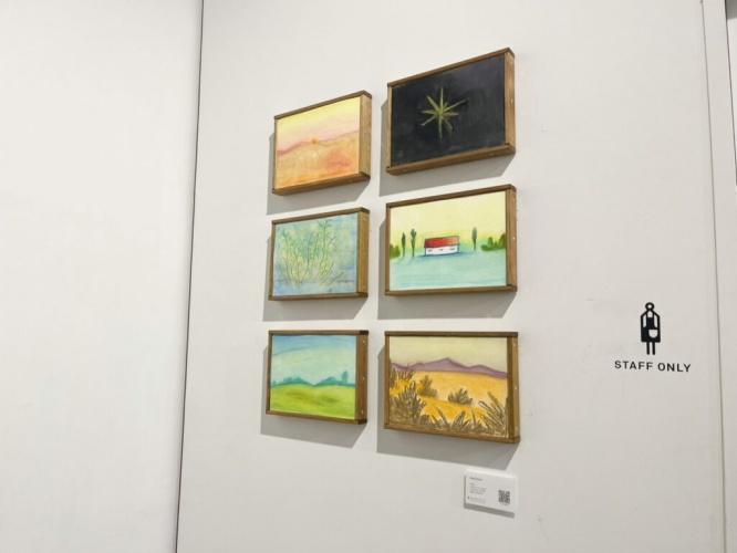 中にはいたるところにアート作品が。温かみを感じる木のテーブルや白壁の店内に、アート作品がよく馴染んでいて、まるでカフェと美術館が融合した世界のよう。