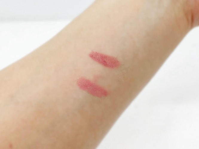 ティッシュで強くふき取った後腕に塗ってティッシュで強くふき取ってみましたが、この密着力。でも“塗っている!”という重さはなく、自然にフィットしてくれます。マットな仕上がりが好みの方は大満足すること間違いなしのリップですよ。