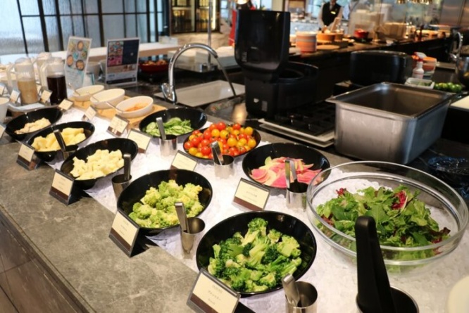 サラダコーナーには、ミックスリーフ、きゅうり、ブロッコリー、カリフラワー、ロマネスコ、カラフルミニトマト、カラフル大根などの新鮮な野菜がずらり。好みのドレッシングとトッピングで楽しみましょう。