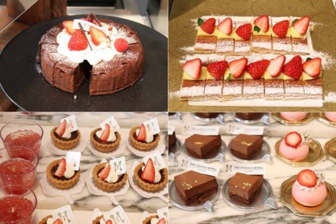 スイーツコーナーには、苺のショートケーキ、苺のバトンパイ、苺のムース、苺のジュレ、ガトーショコラ、チョコレートのロールケーキ、ムースショコラ、ショコラタルトレット、チョコレートのパンナコッタなど、旬の苺や濃厚なチョコレートを使用した可愛らしいスイーツが並びます。