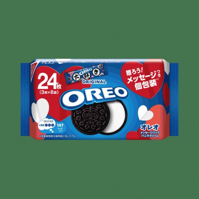 最後にご紹介するのは、世界100か国以上で愛されるビスケット「オレオ」。バレンタインに合わせて、3文字メッセージつきの個包装が入った『オレオ メッセージパック バニラクリーム 24枚』が発売されています。