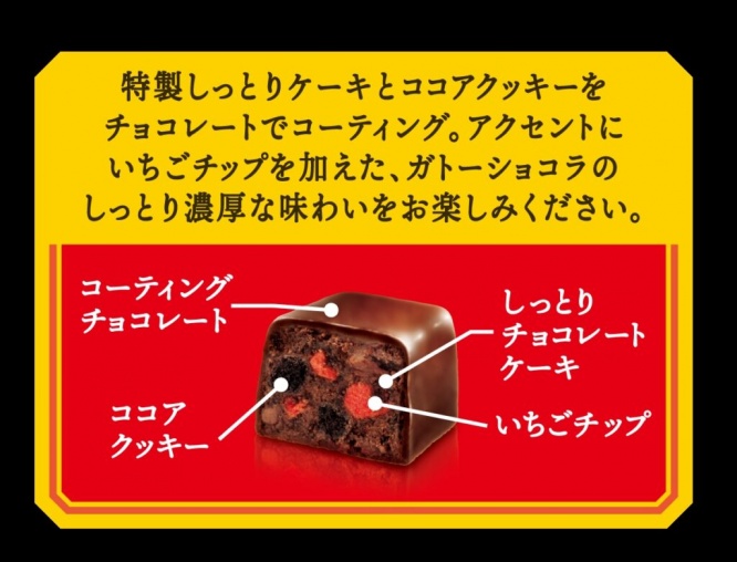 特製のしっとり濃厚なチョコレートケーキとココアクッキーを、まろやかでコク深いチョコでコーティング。さらに、フレッシュな香りと酸味が特長のいちごチップが華を添えます。ひとくちサイズで食べやすく、濃厚な味わいとしっとりした食感に癒されるおやつ。