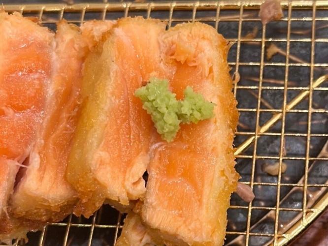 ではまず、サーモンレアカツをそのまま。中心部のレアなとろける旨み、衣の香ばしさのマリアージュが最高!そして、サーモンの旨みでご飯を一口。ご飯の甘みと旨みとの調和が美味しすぎる……。