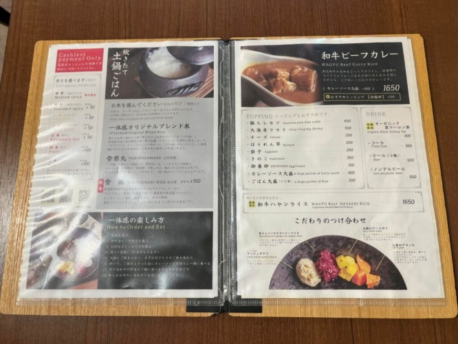 ※写真は2025年12月11日撮影(現在は価格改定されています)メニューは名物の和牛ビーフカレーだけでなく、ハヤシライスも並んでいます。チーズや豚ヒレカツなどのトッピングも充実。