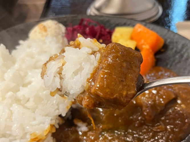 ではさっそくいただきます。カレーは牛肉の旨み、果物のフルーティな甘みがギューッとつまっていて、奥深いコクを感じます。じわじわと辛みが来るのですが、そこがまた絶妙で、甘みと辛みの相乗効果がスゴイ!さらに、ご飯のしっかりとした旨みが加わると衝撃的な美味しさです。
