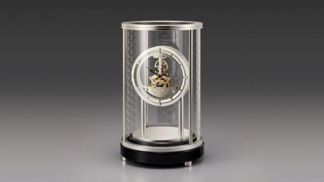 スケルトンムーブメントの美しさを引き立たせる、浮遊感のあるレイアウト、そして江戸切子と精緻な加工技術が融合した、唯一無二の置き時計です。