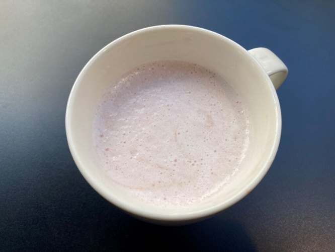 それではいただきます。優しいミルクと桜の甘さが口の中にふんわりと広がる!最初は、手前のチョコソース側から飲んでみたのですが、ぎゅっと濃厚な甘さがアクセントになっています。続いて、さくらシェイブ側から飲んでみると、桜餅のような華やかな風味と香りをダイレクトに感じて美味しい~。
