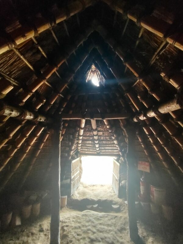 ③ 驚きの「防虫・防腐」システム竪穴住居には炉が設けられ、多くの時間は火を炊ていたと考えられています。屋根の頂部には排煙や換気のための「換気口」があり、炉の煙は大きな屋根の隅々まで行き渡る構造になっていました。