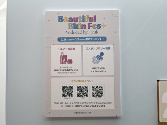 今回は、現在開催中の「Beautiful Skin Fes+ Produced by Hyuk」をご紹介しました。気になるアイテムや、最新アイテムを一度に試せる貴重なイベントです。3月6日(金)からは整理券の配布方法が変更となっていますので、公式Instagramを必ず確認してくださいね!