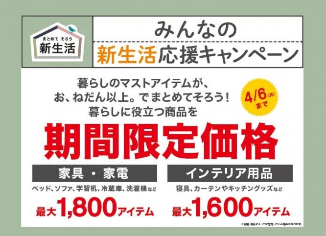 2026年2月20日(金)〜4月6日(月)に開催中の『みんなの新生活応援キャンペーン』では、最大3,400アイテムが期間限定価格になります。ベッドやソファ、冷蔵庫、洗濯機、カーテンやキッチン用品、便利な収納ラックまでが対象。