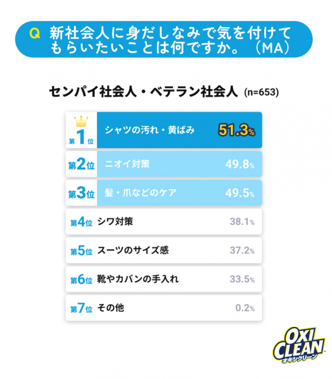 調査では、センパイ・ベテラン社会人(20~50代)が「新社会人に気をつけてほしいこと」として最も多く挙げたのが シャツの汚れ・黄ばみ(51.3%) でした。これは、ニオイ・髪型・爪・服装全体、といった項目よりも高い割合となっています。