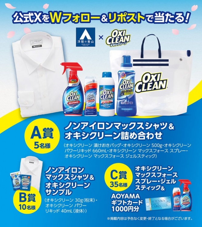 洋服の青山公式X:@AoyamaOfficialオキシクリーン公式X:@OXICLEANJP対象投稿:オキシクリーン公式アカウントのキャンペーン投稿