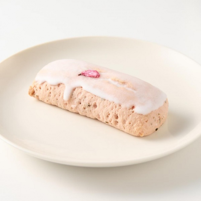 ●不揃い 桜スコーン(180円)ほのかな桜の香りと塩味がアクセントのスコーン。外はサクッ、中はしっとりとした食感が特徴です。ほどよい甘さのシュガーコーティングと桜の塩漬けがトッピングされていて、春らしい風味が楽しめます。