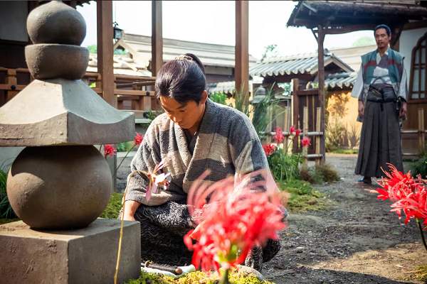 直の墓前にて。小一郎の背を見守る喜左衛門の眼差しには、少し温かみが感じられる。NHK大河ドラマ「豊臣兄弟!」公式サイトより。🄫NHK