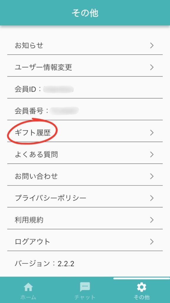 当選から約1か月が経ちました。アプリを開いたら画面右下の「その他」内にある、ギフト履歴を選択。
