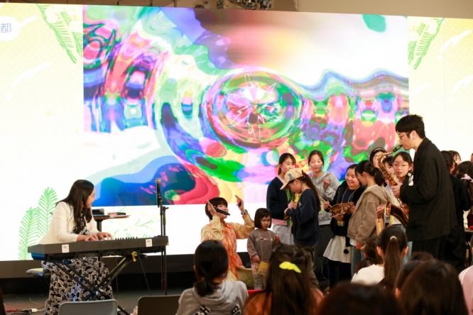 中島氏は「カオスになりそう」と始める前に言ってはいたが、実際にセッションが始まってみると、中島氏のピアノやMini KURAGE Bandの3人の演奏を基軸として、ガンバレルーヤや子どもたちの演奏がうまく混ざり合い、聞いたことのないような音と、音が表現された映像とともにセッションが行われていた。