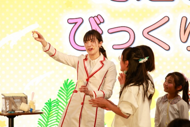 ステージ上の三人と客席の参加者たちの決めポーズと「レッツ!サイエンス!」の掛け声でサイエンスショーはスタートした。ペットボトルに入った生クリームを取り出した五十嵐氏は、これを使ってバターを作りますと言い、クイズを出題。生クリームからバターを作る方法を、よしこは「生クリームを励ます」とボケて会場の笑いを誘ったが、正解は「振る」だった。