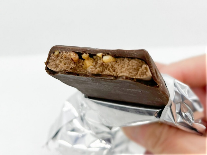 さっそくいただきます。まずは、パリっとした板チョコアイスならではの食感が心地よく、ナッツのザクザク感がまたいいアクセントに。チョコとジェラートが口内の温度で一気になめらかになり、ビターな味わいが広がります。板チョコの濃厚なとろりとした味わい、ジェラートの芳醇なカカオのコクが重なり合い、甘すぎない程よい苦みがたまりません。
