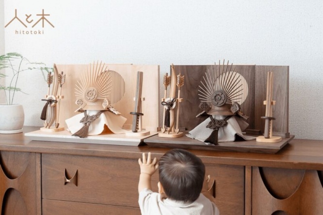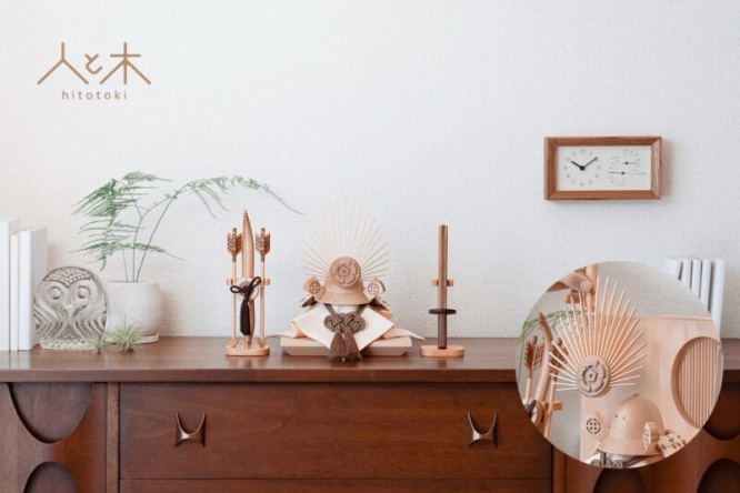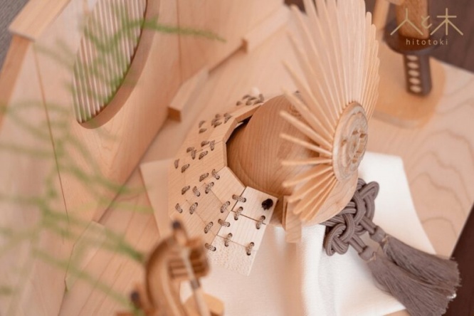 着色しておらず天然の木目を生かした滑らかな触り心地の兜を、お子様と一緒に手に取り木のぬくもりを確かめながら楽しく飾ることができます。