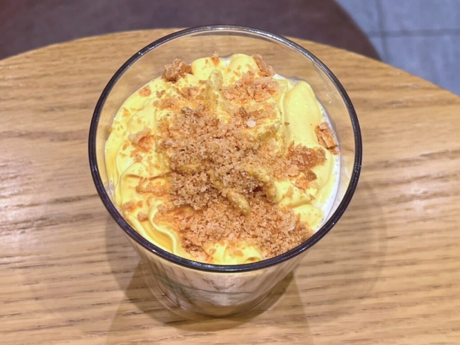 上にトッピングされているのは、シュー生地に見立てたクランチ。その下はカスタードフレーバーのホイップ。華やかな風味のバニラビーンズが使われているそう。鮮やかな黄色がタンポポや菜の花、ミモザなどの、春の花々を連想させます。