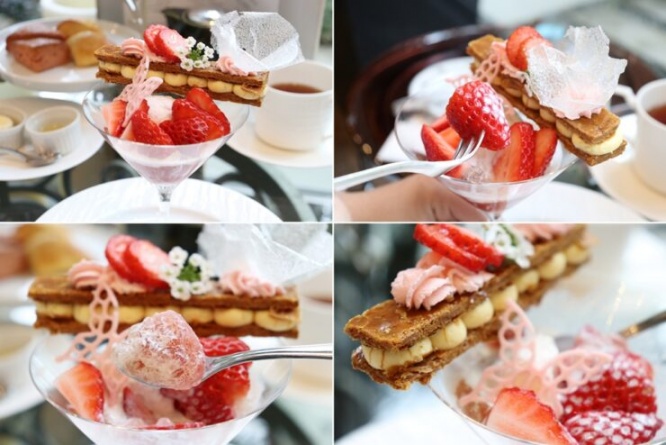 アフタヌーンスタンドを上から順に紹介します。スタンドの1段目には、いちごと桜のヴェリーヌ、いちごとライムのムース。