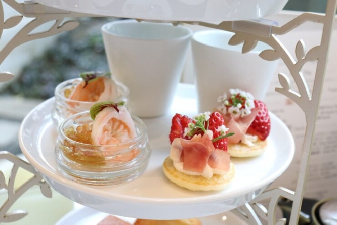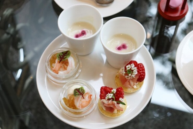 スタンドの4段目はセイボリーのプレートで、サルシフィーのスープ、ベリーと生ハムのブリニ、天使海老のマリネ カリフラワームースとコンソメジュレの3種類が載っています。