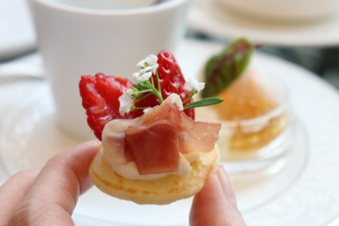 ベリーと生ハムのブリニは、もちもちした食感の小さなパンケーキに、クリームチーズ、生ハム、いちごとラズベリーをのせたもの。甘酸っぱいベリーと生ハムの塩味がよく合います。