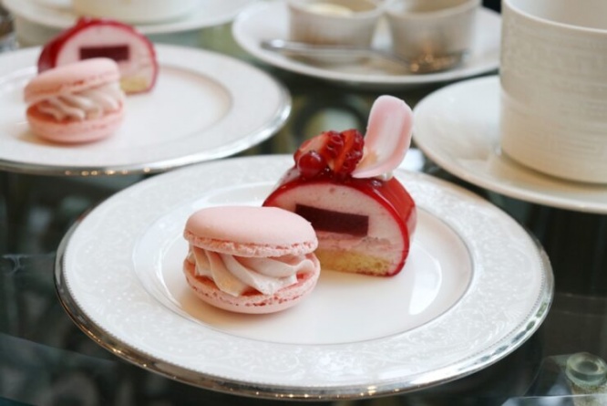 スタンドの3段目には、いちごと桜のマカロンと、いちごとレアチーズのムース。