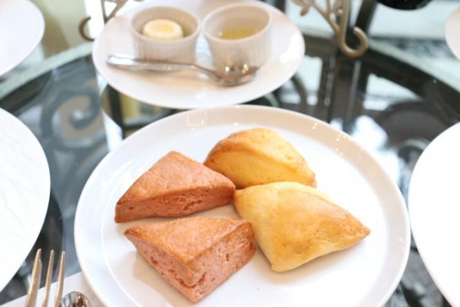 スタンド5段目には、ホテル内ベーカリーで焼き上げるスコーン(ミルク/苺)。三角形のスコーンはやや小ぶりで、表面はサクッ、中はしっとりした食感です。