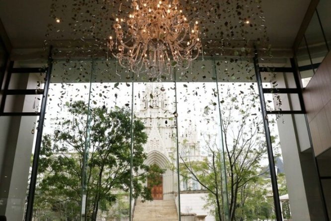 窓の外にストリングスホテル 名古屋のシンボルである大聖堂が見えるロマンティックな空間で、春だけの贅沢なアフタヌーンティーを楽しんでみてください。11:00から21:30まで利用できるので、ライトアップされた大聖堂を眺めながらのナイトアフタヌーンティーもおすすめです。