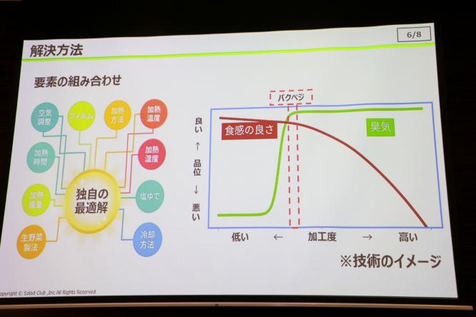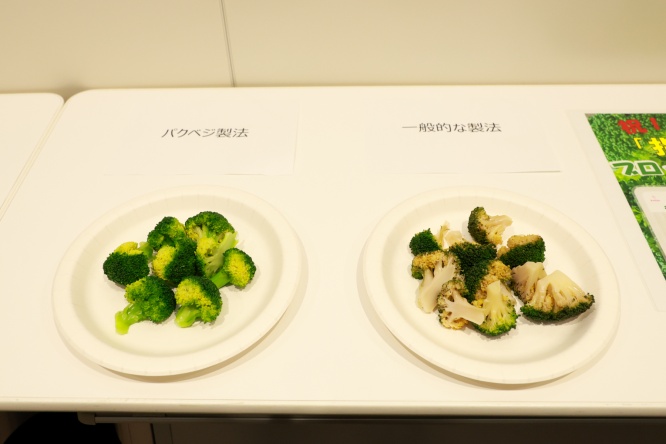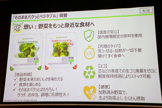 発表会当日は、加熱処理済み商品の導入と中期的戦略の説明に加えて、第一弾商品である「そのままパクっとベジタブル」(「パクベジ」)シリーズの開発背景や独自技術について紹介した。