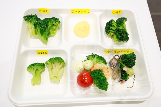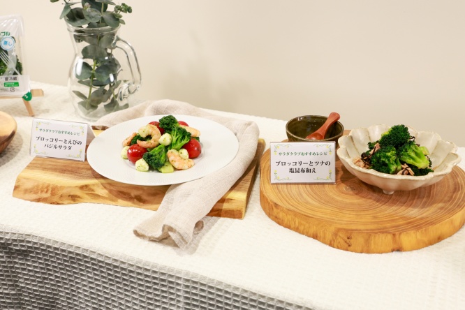 サラダクラブ マーケティング部 商品開発チーム 平塚寧々氏からは、「そのままパクっとベジタブル」を使用したおすすめレシピが紹介された。イタリアン風の「蒸しブロッコリーとえびのバジルサラダ」と「焼きブロッコリーとツナの塩昆布和え」が紹介されたほか、会場ではそれらのメニューとそのままの「パクベジ」を試食でき、食感や香りを実感することができた。