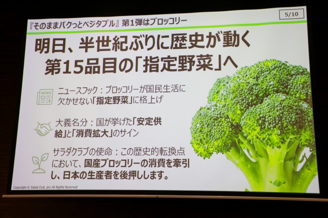 野菜摂取量不足の解決、タイパ重視に見合う商品として、第一弾にブロッコリーを選んだと説明。4月1日、ブロッコリーは52年ぶりに15品目目の「指定野菜」に格上げされる。