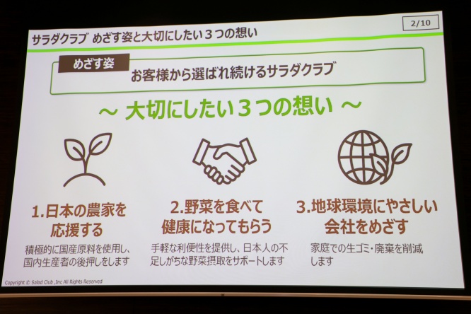 また、地球環境に優しい会社を目指すために、パッケージサラダの特徴である「芯」などの生ゴミが出ない点や、鮮度保持技術により廃棄ロスが少ない点を活かす。今後は芯の活用も検討し、サステナブルな活動も進めていきたいとしている。