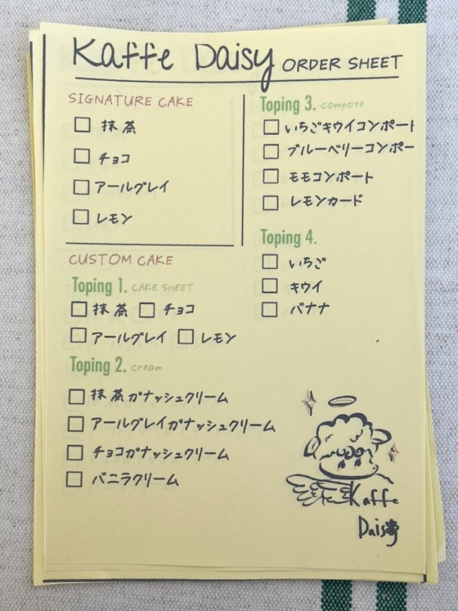 そして注目なのが、こちらの用紙。ケーキのベースやトッピング、クリームなどを選び、自分好みのケーキをいただくことができるんです。せっかくなので、カスタマイズで注文。