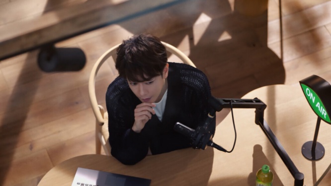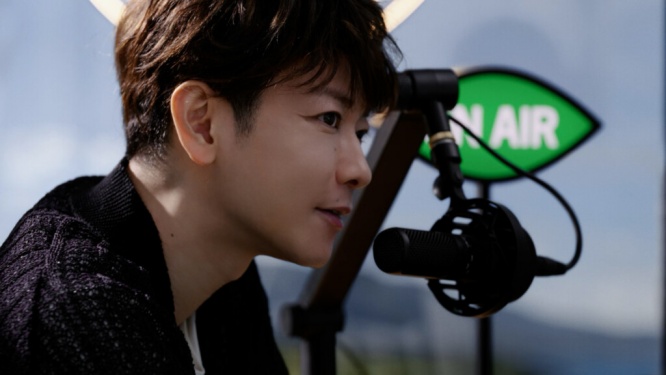 CMストーリーラジオブース「HITOIKI STUDIO」で、パーソナリティを務める佐藤健。